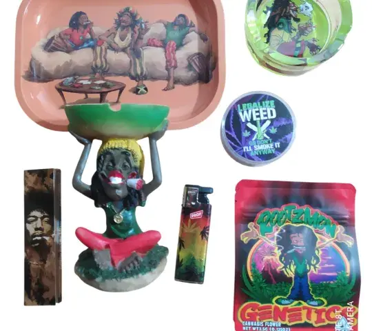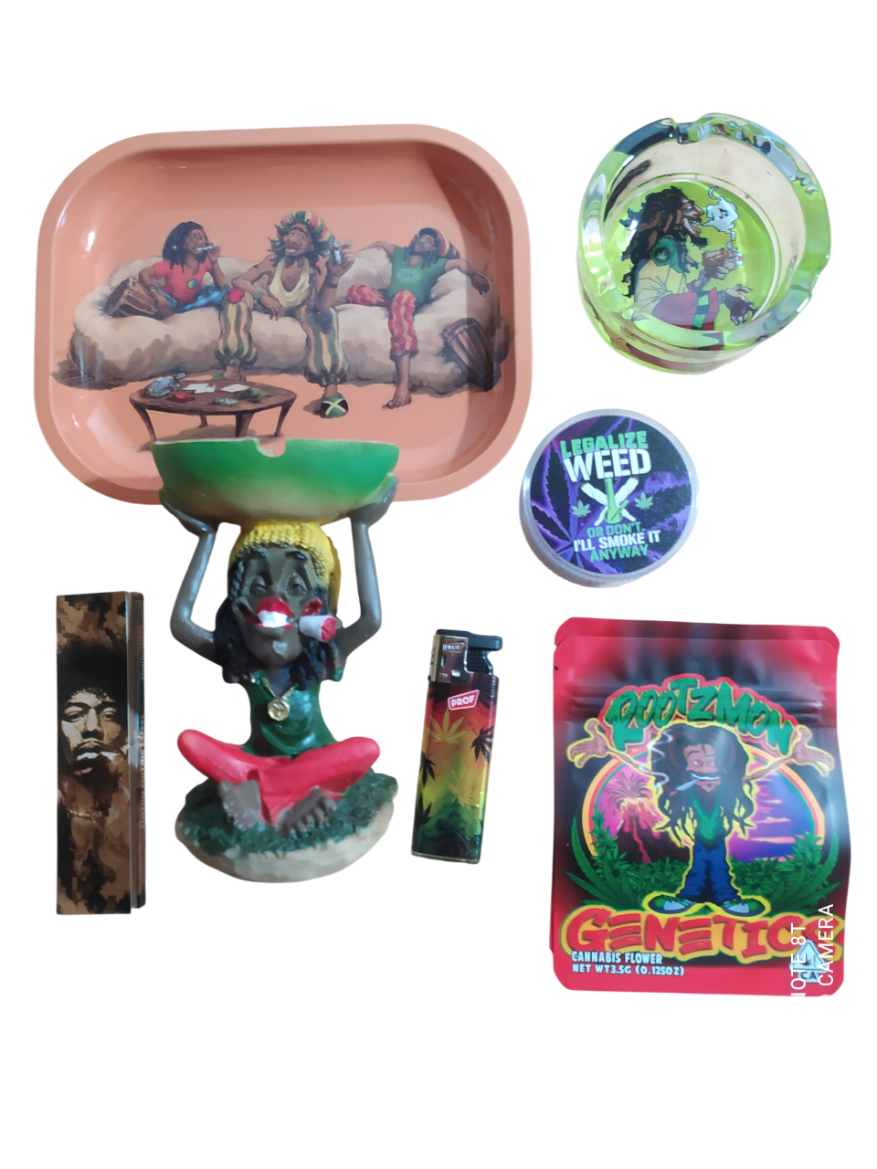 Inicio SET RASTA 11 Incluye: 2 bolsas mylar 1 bandeja 18x14cm 1 cenicero cristal 1 grinder plástico 60mm 1 cenicero resina 1 soplete 1 papel+tips de Jimmy Hendrix Regístrate para comprar