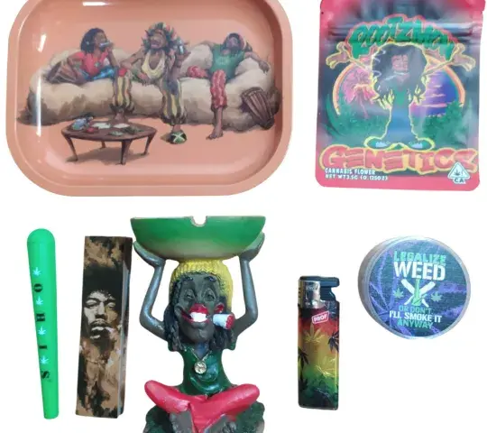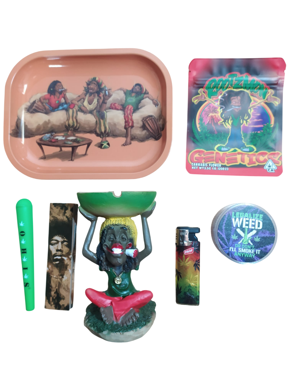 Inicio > Todas las categorías > SETS SET RASTA Incluye: 1 bandeja de metal de 18x14cm 2 bolsa mylar 1 papel+tips de Jimmy Hendrix 1 cenicero de resina 1 portapetas 1 soplete 1 grinder de plastico de 60mm Regístrate para comprar